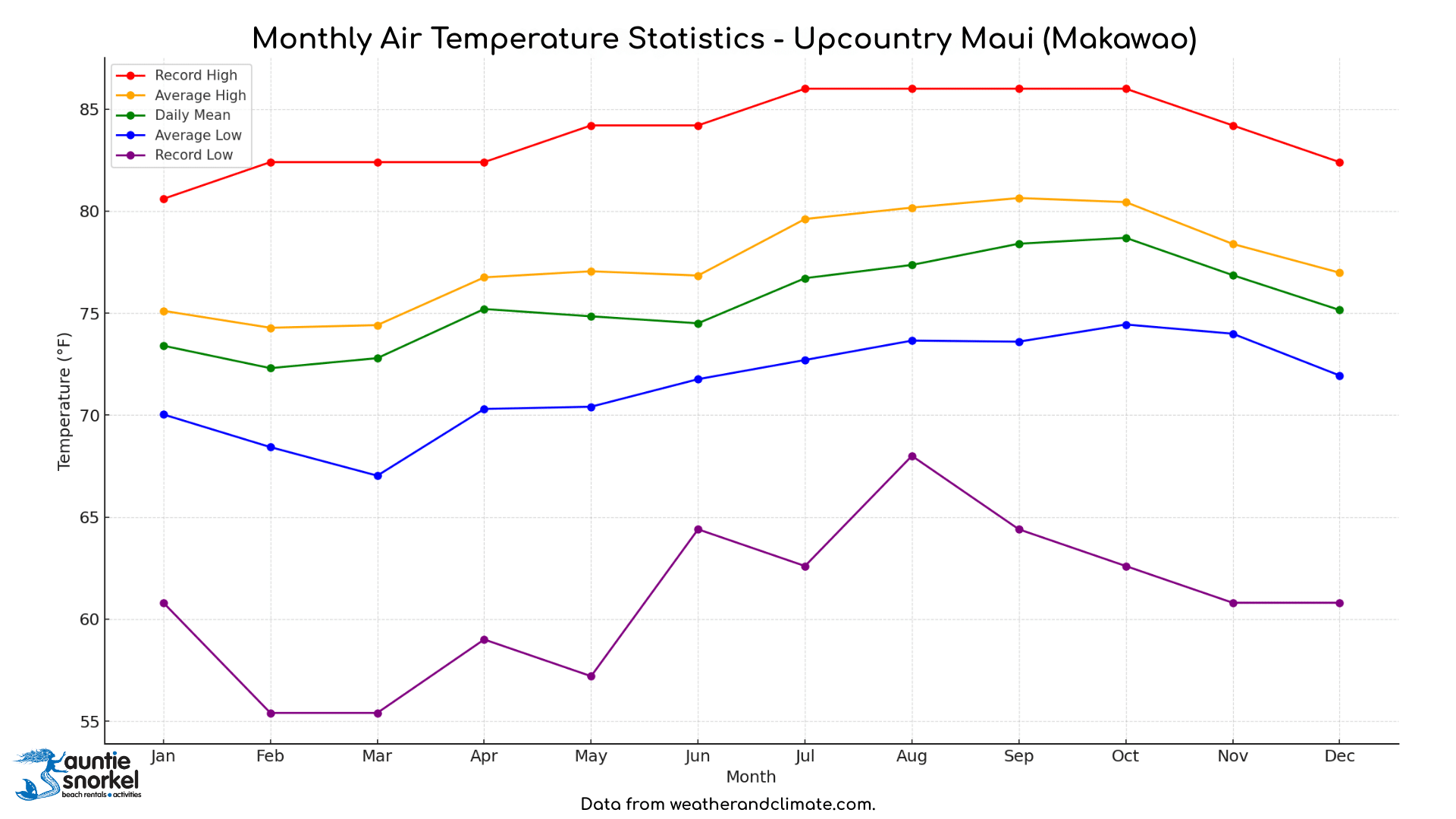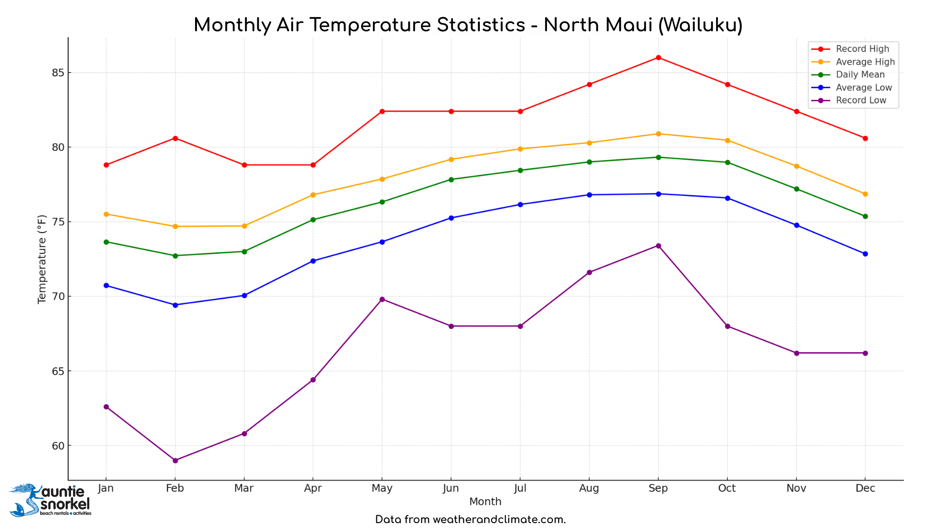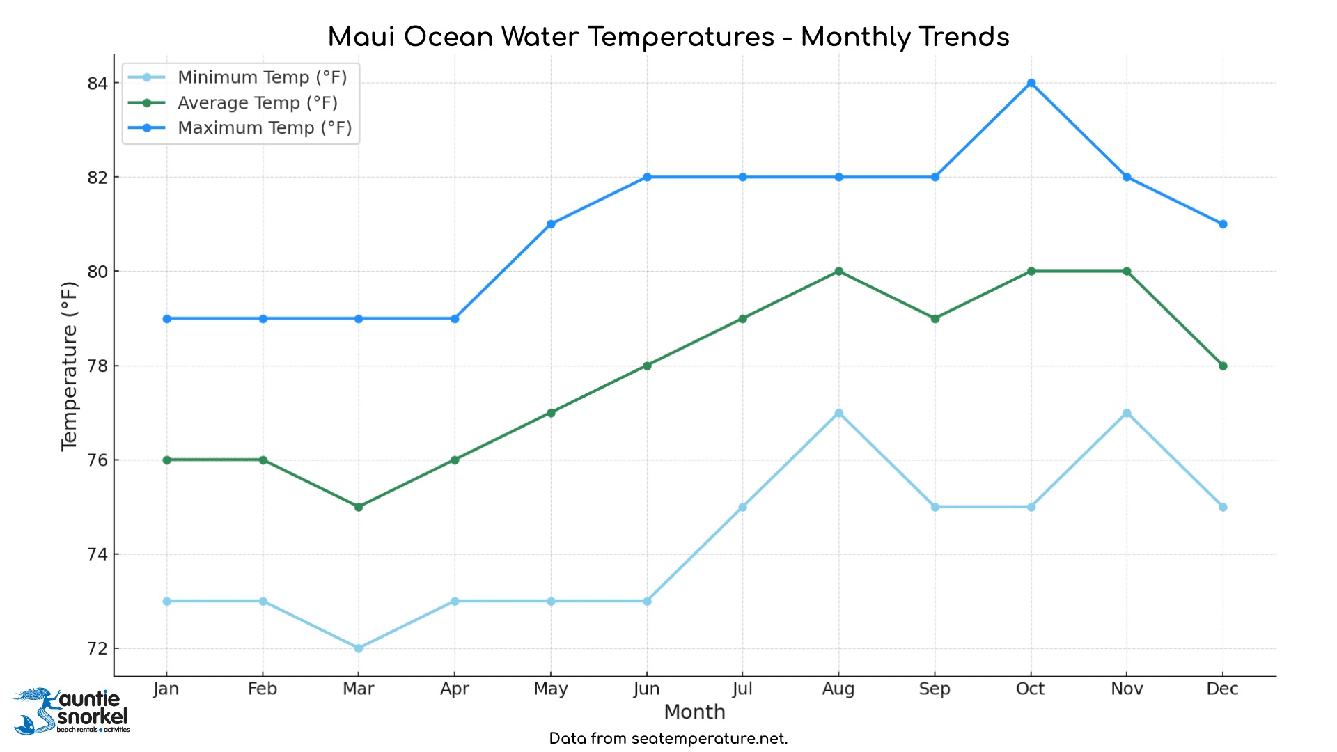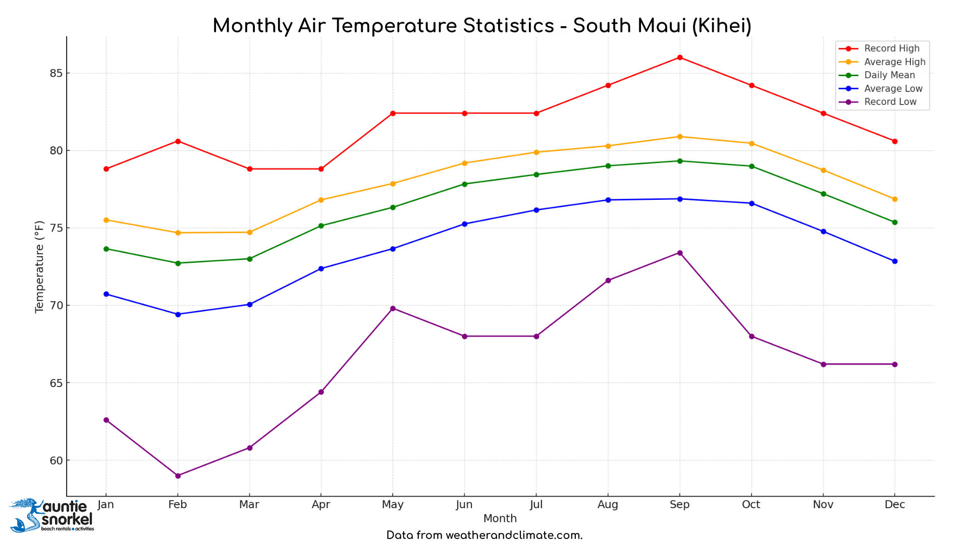 Summer in Maui (June through August) means sunshine nearly every day, with highs in the low- to mid-80s°F (27–29°C) and steady trade winds from the NE. Ocean temperatures stay around a perfect 78–81°F (25–27°C)—ideal for snorkeling, SUP, and beach lounging. For more, check out our detailed guide on Maui Weather and Water Temperatures throughout the year here.