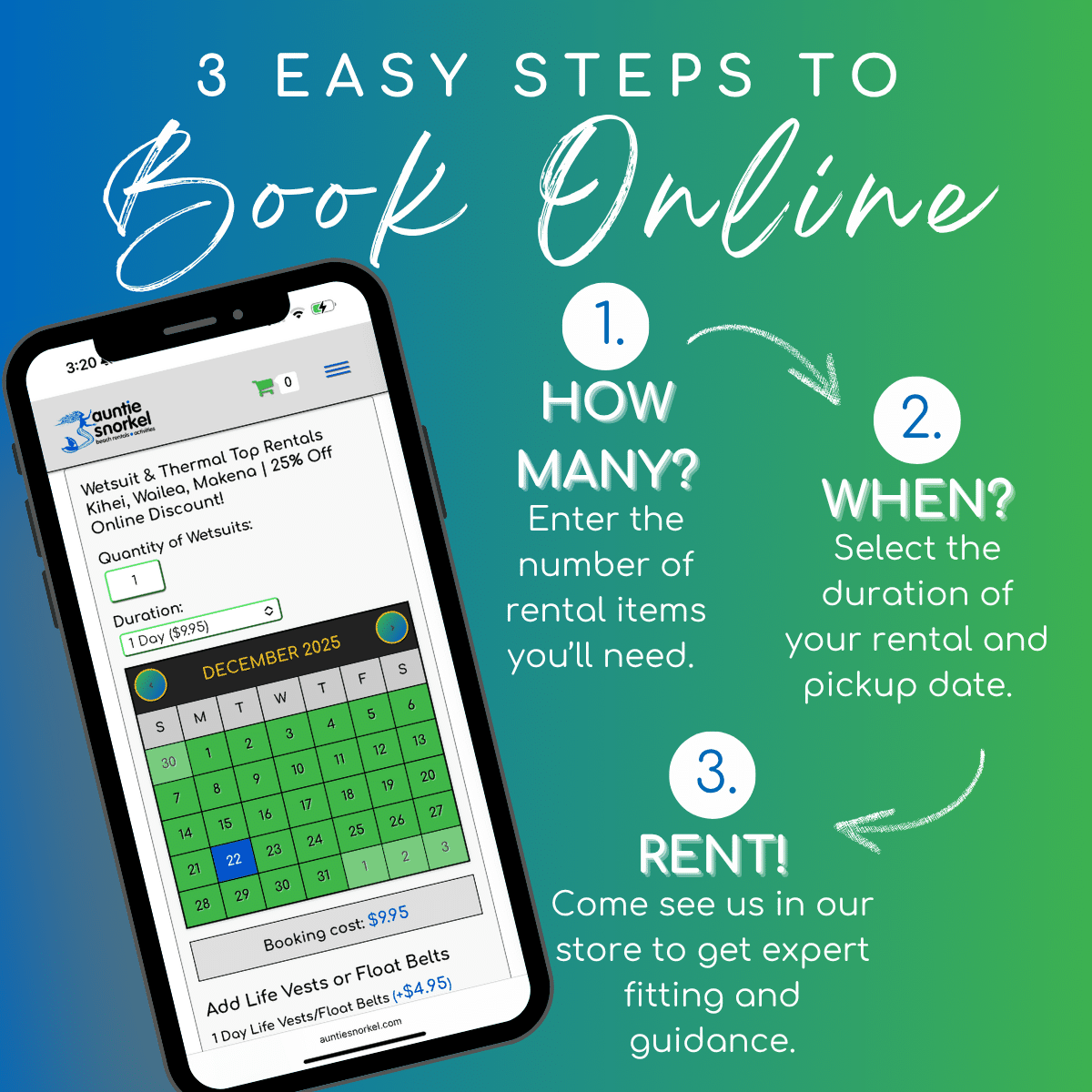 Reserve your spring suit (a wetsuit with short sleeves and shorts) or thermal top online for our 25% off savings and then come to the shop to pick up your rentals between 8:00 am – 5:00 pm 7 days a week.