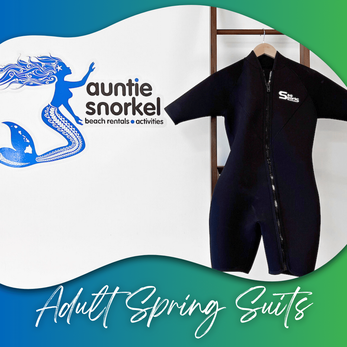 You will be comfortable and warm snorkeling for hours wearing one of our soft, flexible wetsuits (spring suit or thermal top). Spring suits are wetsuits with short sleeves and shorts. A thermal top is a short-sleeve wetsuit jacket.