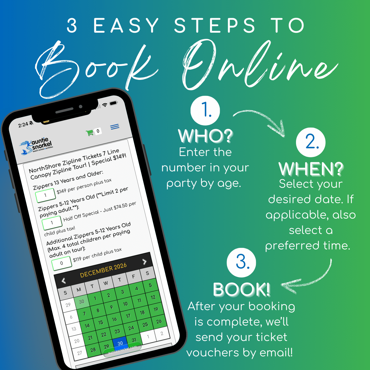 It’s easy to book your NorthShore Zipline 7 Line Tour right here online.