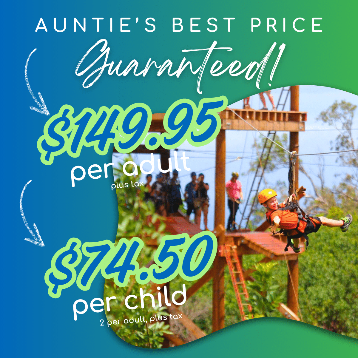 Kids ages 5–12 are half off (up to 2 per paying adult), making this one of the most family-friendly and affordable zipline options on the island. Ages 5 and up are welcome, and the course is designed so that even first-timers and grandma can enjoy every line.