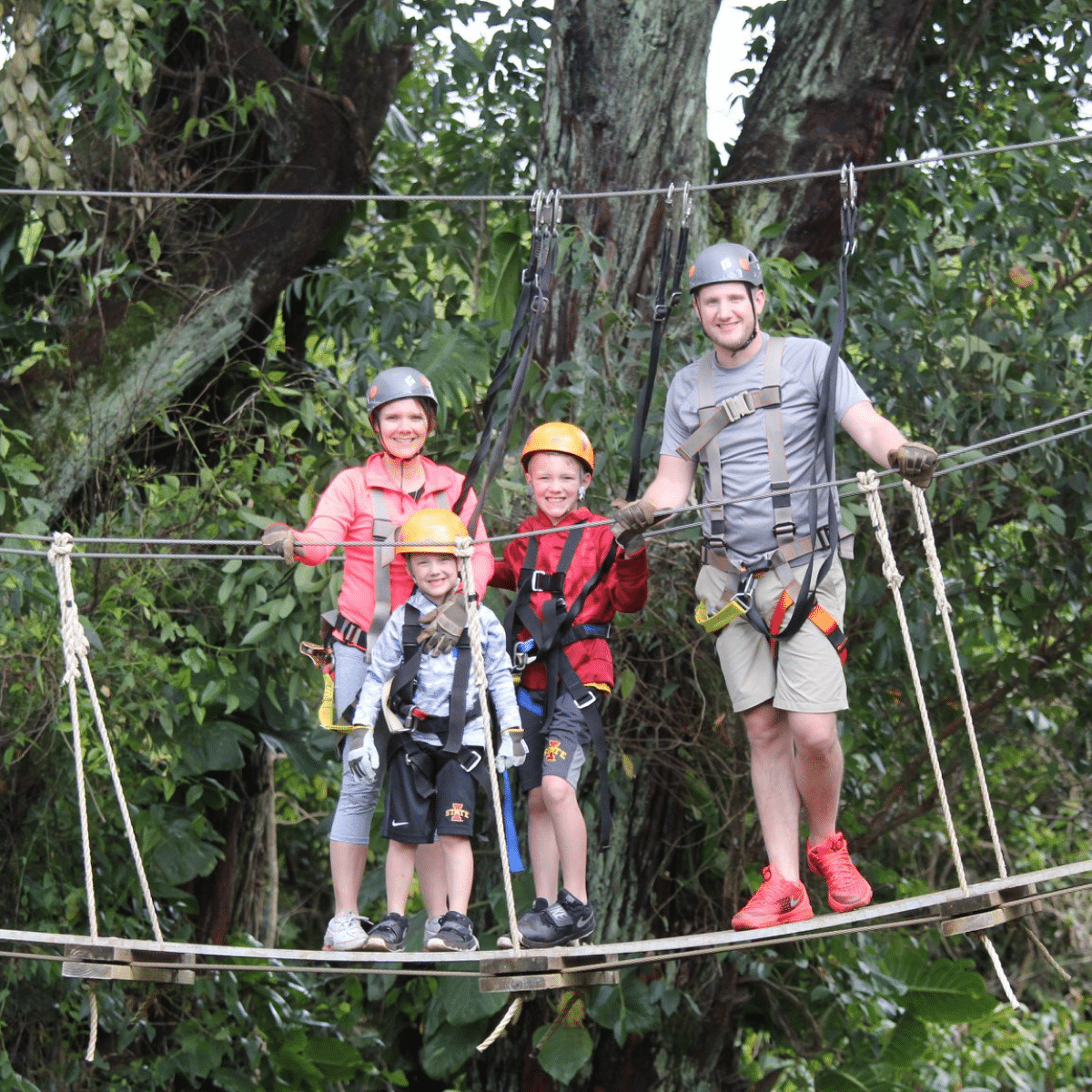 Very manageable for most guests. There’s approximately ¼ mile of easy walking between ziplines and a few short staircases. The pace is relaxed and guided. It’s more about comfort with movement and heights than athletic ability.