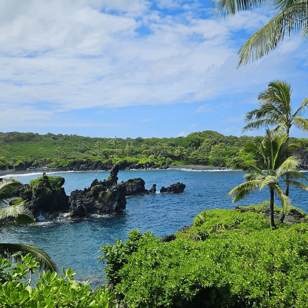 Two stops tend to leave the deepest impression. Ke’anae Peninsula, with its 1860 church, ancient taro fields, and raw volcanic shoreline, gives you a genuinely unfiltered glimpse into old Hawaiʻi. And Waiʻānapanapa’s black sand beach is one of those places one simply has to see in person. The jet black sand, the deep blue water, the wind-twisted foliage along the shore — photos come close but never quite capture it.
